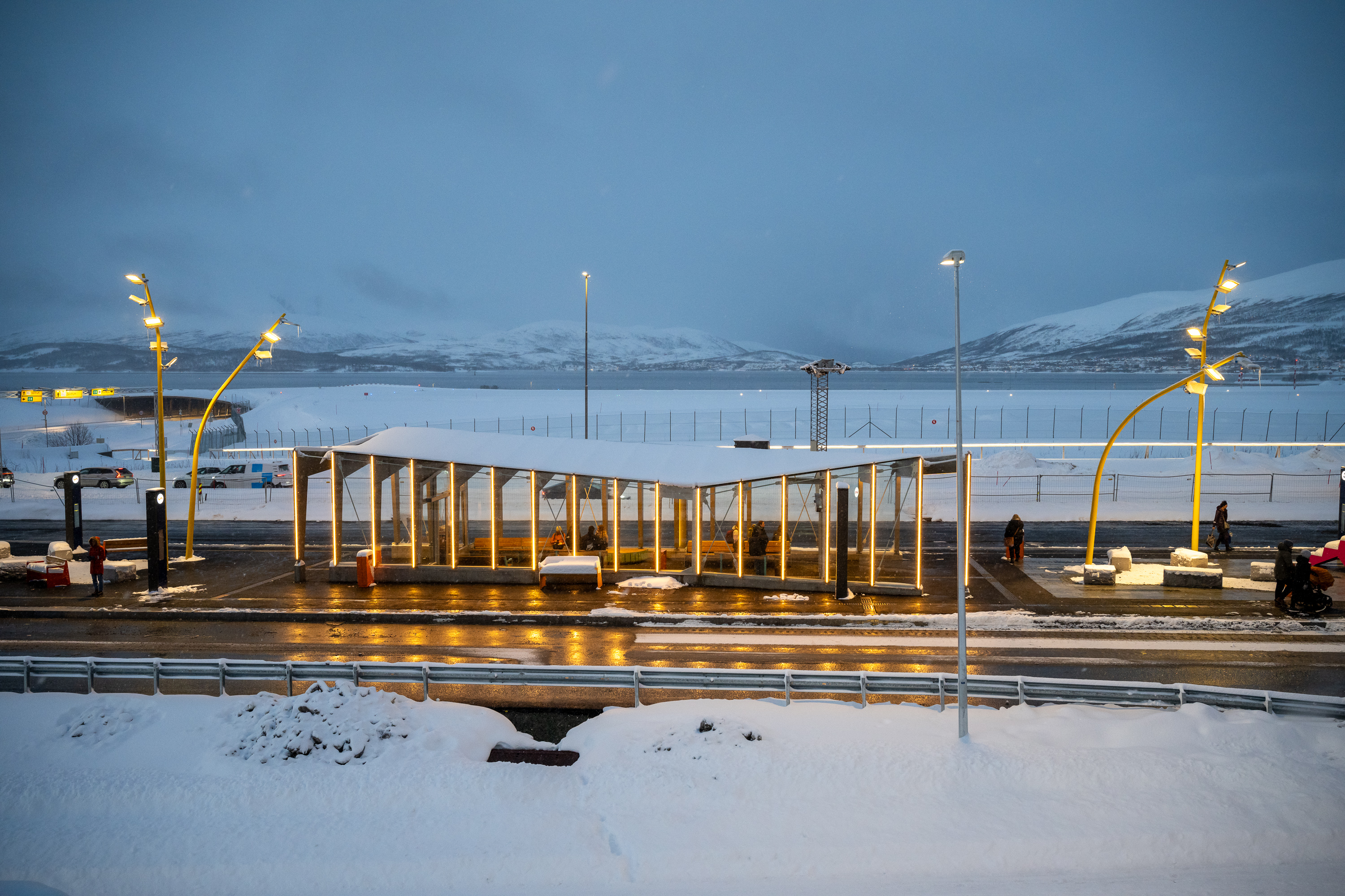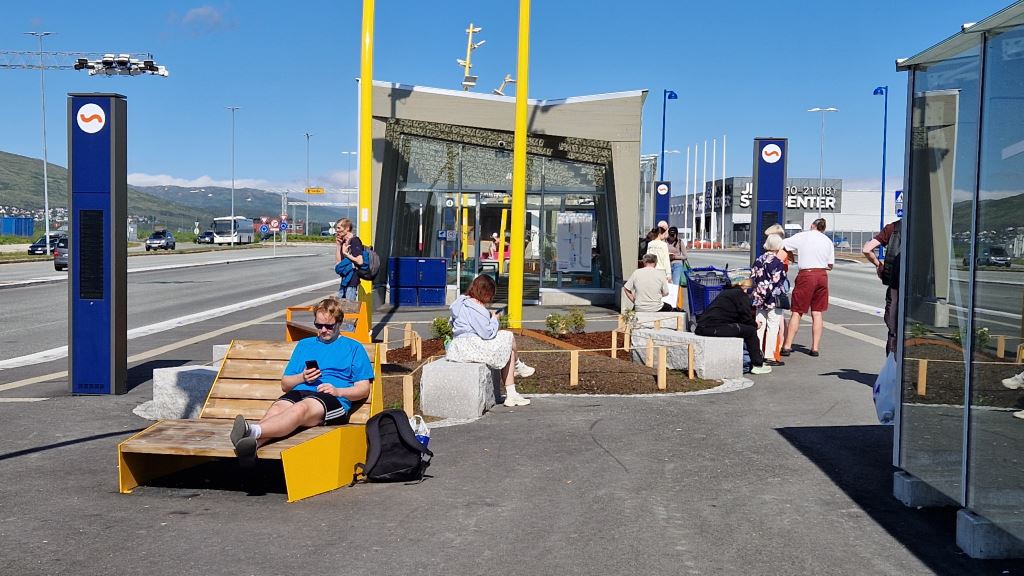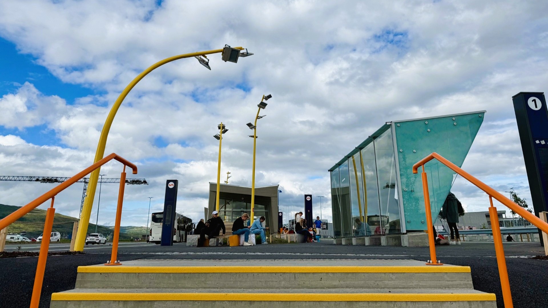 Lysmastene spiller også en sentral rolle i det visuelle uttrykket. De knallgule, buede mastene tilfører anlegget en tydelig identitet og fungerer som orienteringspunkter i området. Bruken av farger gjør terminalen mer innbydende og lett å lese, der ulike soner og funksjoner fremheves på en intuitiv måte. Samlet fremstår terminalen helhetlig og moderne og et godt sted å være mellom av- og påstigning.
