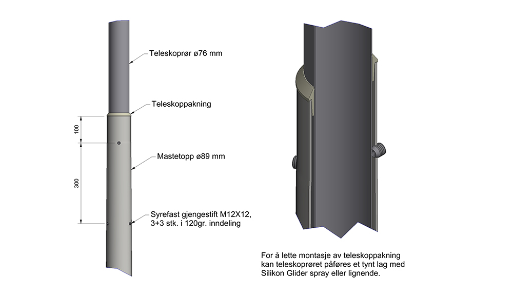 I bunnseksjonen på mastene sørger seks gjengestifter for sikker infesting av teleskoprøret, i overgangen mellom mastetopp og teleskoprør monteres medfølgende pakning.